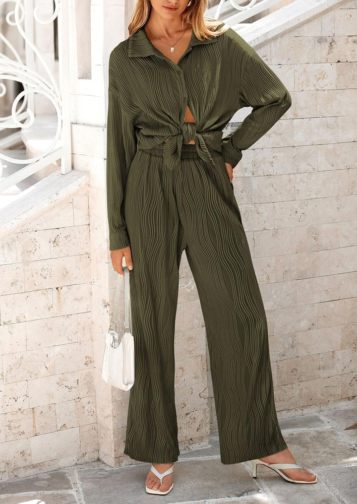 Women's 2 Piece Textured Sets Casual Button Down Shirt Wide Leg Pants Outfit Loungewear Tracksuit