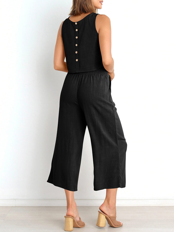 • Features - 2 piece outfits, sleeveless round neck crop top, wide leg cropped pants, button back, high waist,  wide waistband.