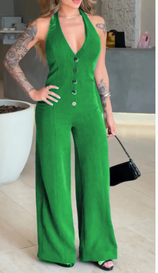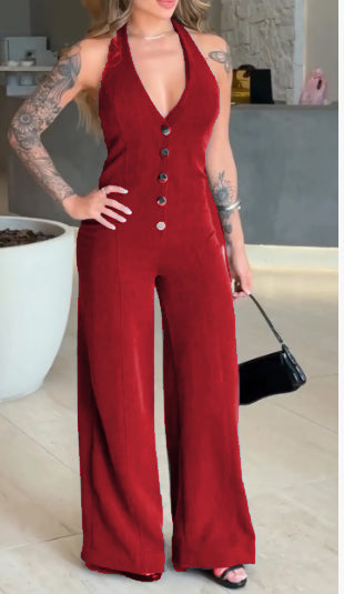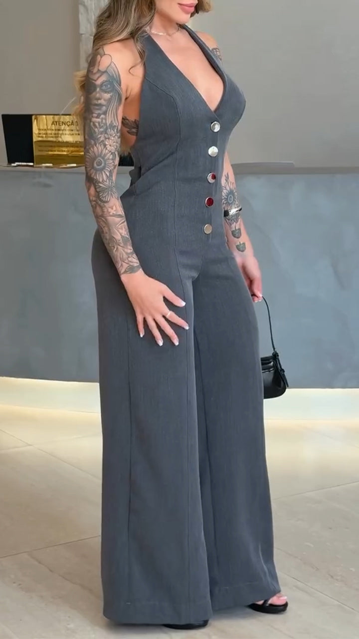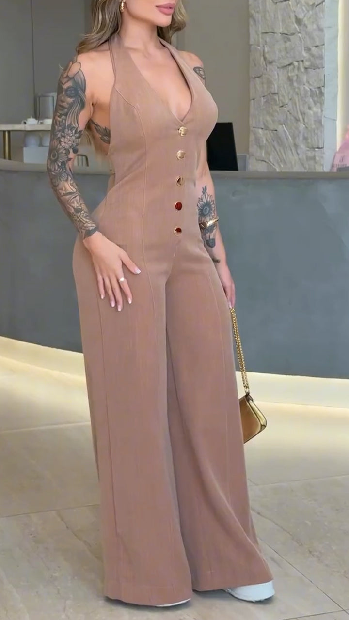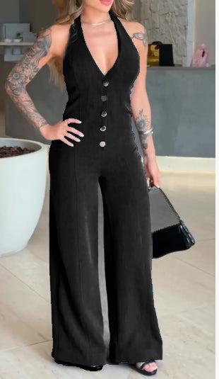 Women's V-neck Sleeveless Halter Neck Button Casual Jumpsuit